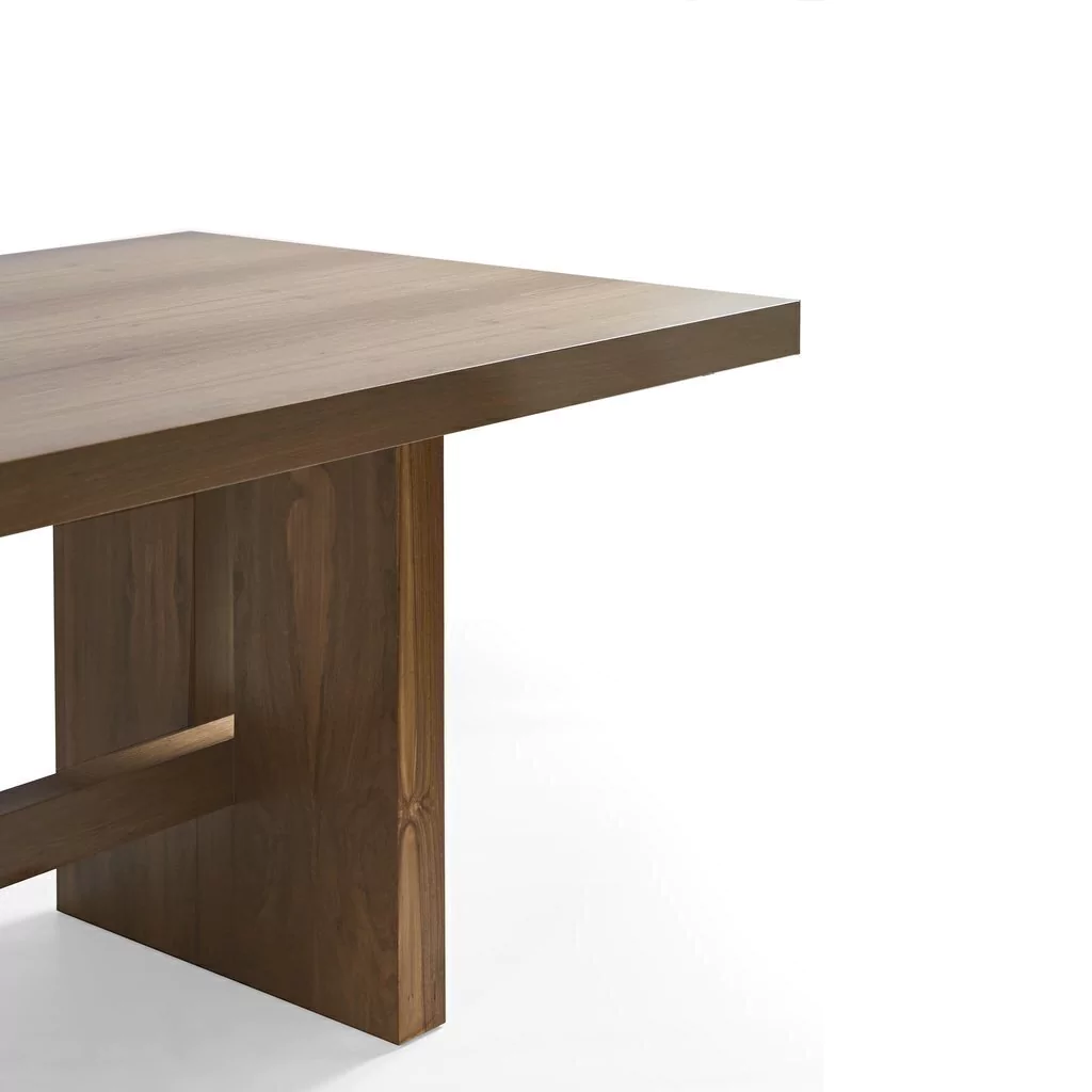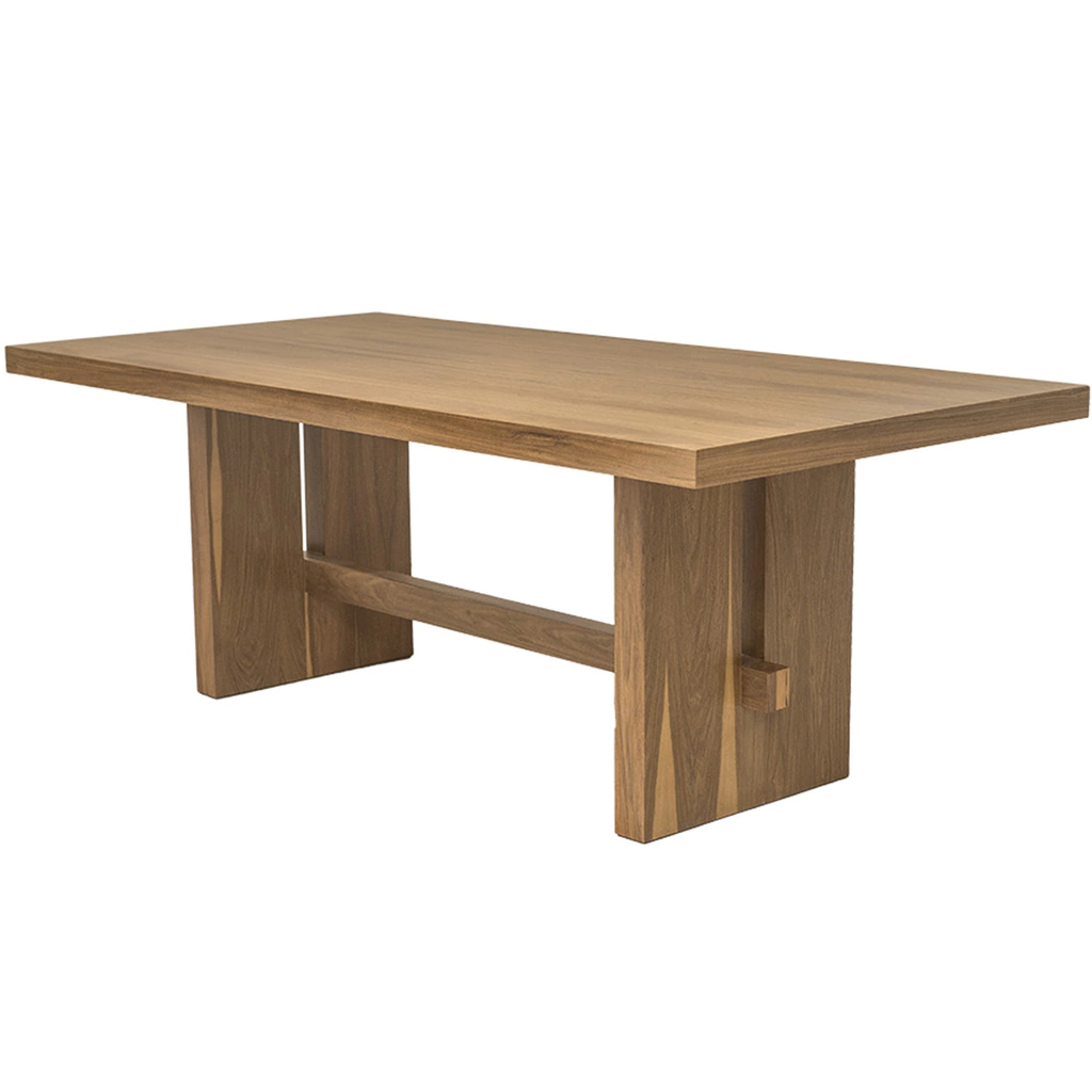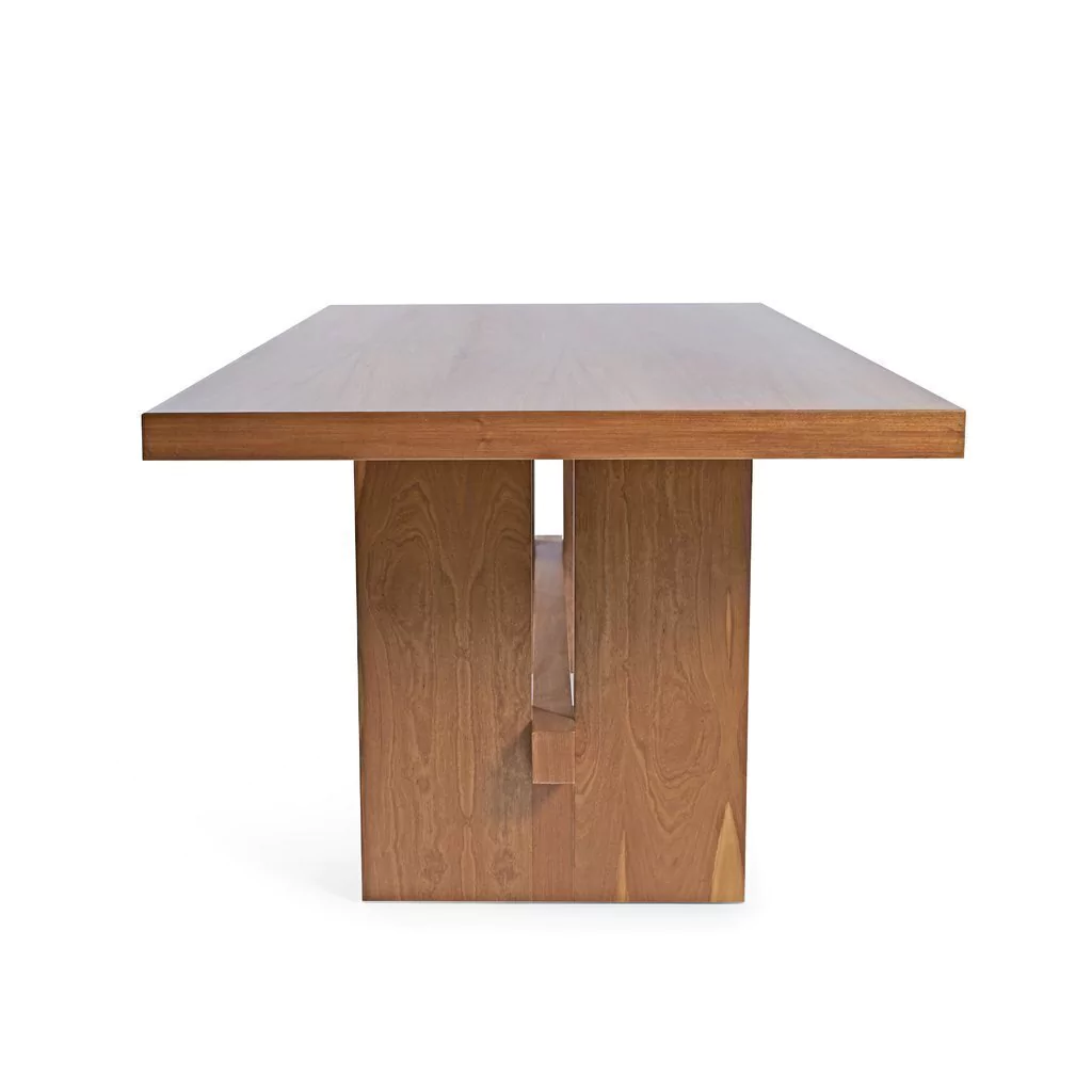 Diseño de lineas simples y armoniosas, con un listón central de madera maciza, el cual se puede apreciar como un detalle en todas sus vistas. De uso funcional ya que sus patas permiten que las sillas cabeceras compartan espacio comodamente junto con las sillas centrales sin generar roces entre los comensales. Fabricada enteramente en madera petribí, con terminación de laca poliuretanica al agua permitiendo que se aprecie la veta y el color real de la madera.