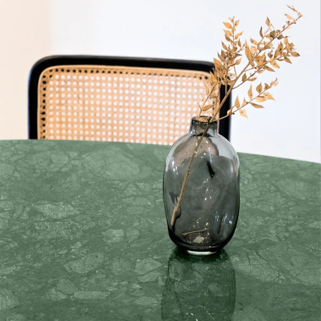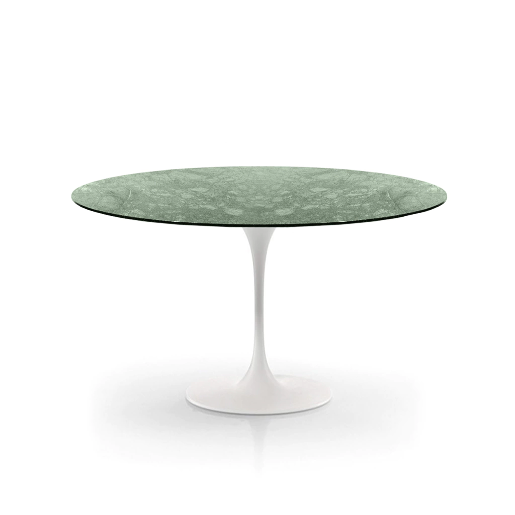 Material: Base de aluminio fundido y laqueado blanco. Tapa de Mármol Circular Verde Guatemala.