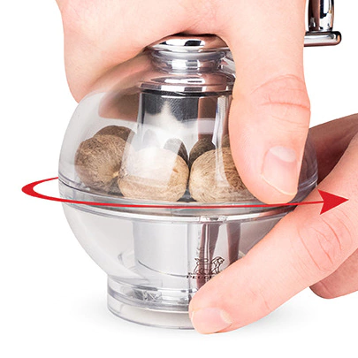 El molinillo de nuez moscada Peugeot Tidore es ingenioso. El potente agarre, la doble cuchilla y el rallador que giran al mismo tiempo crean un polvo de nuez moscada muy fino en un abrir y cerrar de ojos. Basta con girar el mango para disfrutar de todos los sabores de la nuez moscada, sin riesgo para los dedos. Con forma de nuez moscada, con un diseño completamente transparente y atemporal, la parte superior del molinillo Tidore tiene capacidad para 7 a 8 nuez moscada.