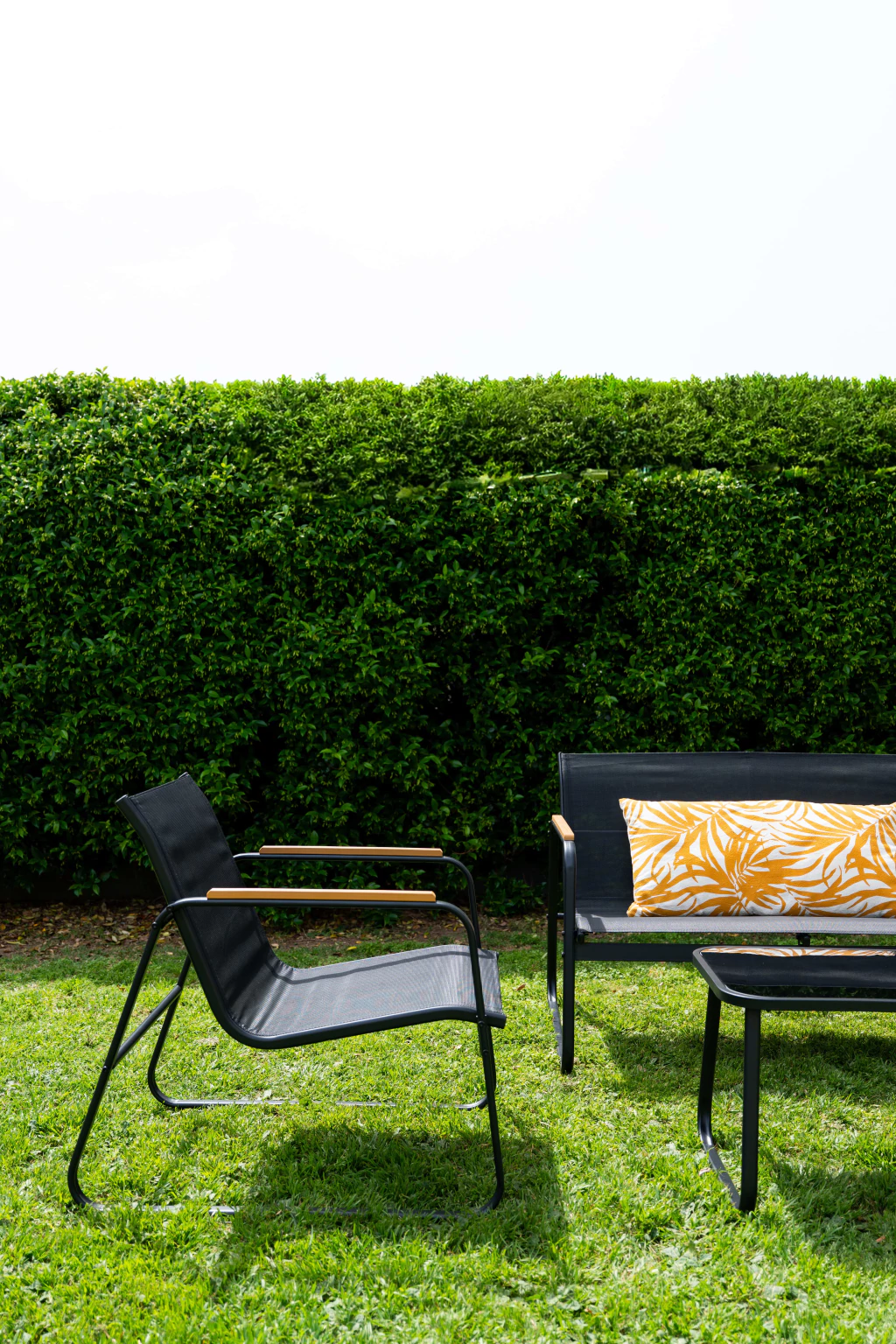 Un rincón pensado para relajarse y compartir. Dos sillones individuales, un sillón de dos cuerpos y una mesa auxiliar baja se combinan en un diseño que une comodidad y resistencia. Sus materiales garantizan durabilidad sin perder calidez. El equilibrio justo entre diseño y funcionalidad para transformar tu espacio exterior en un lugar de encuentro.