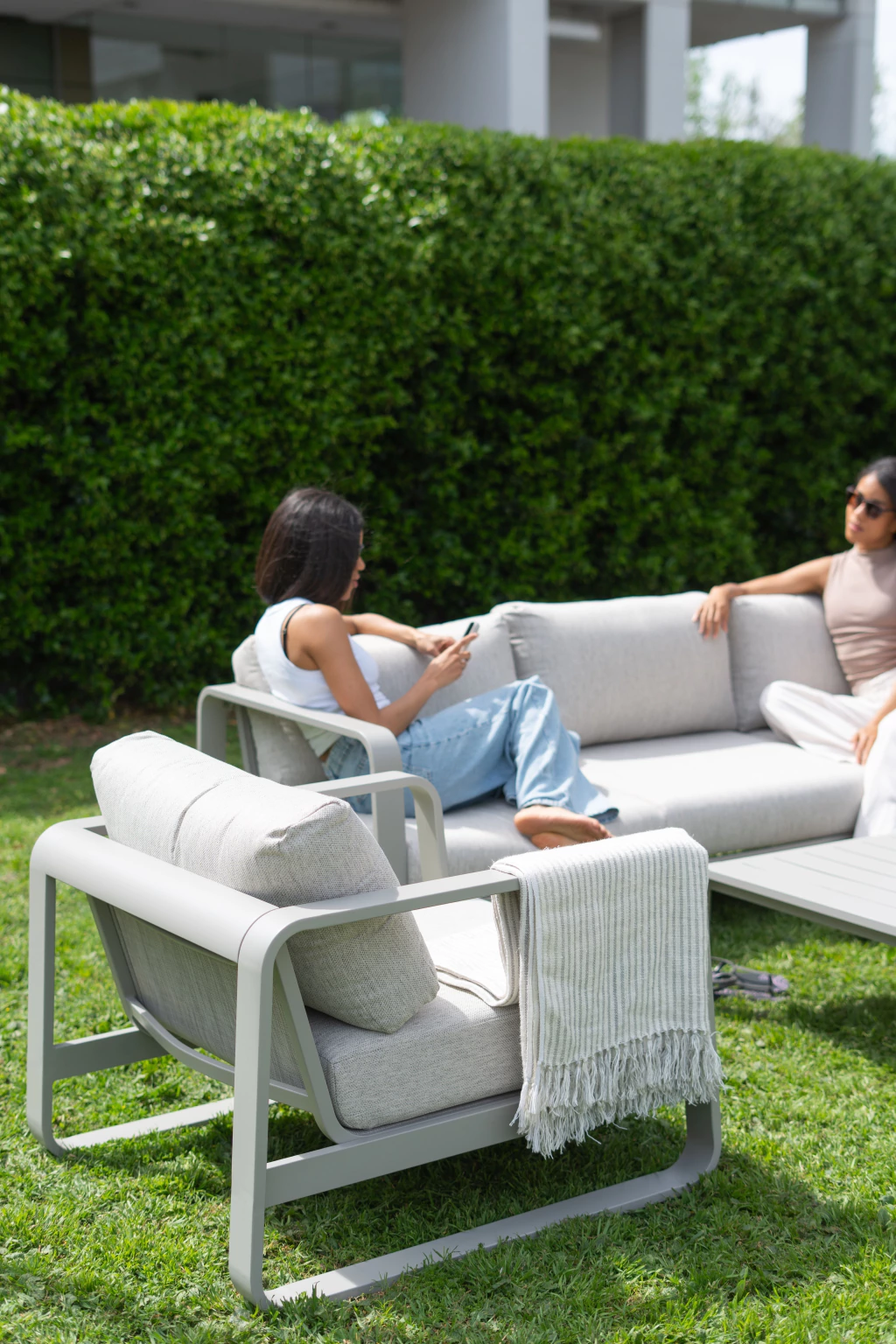 Materiales: Estructura en Aluminio, con almohadones tapizados en tela Spunpoly.