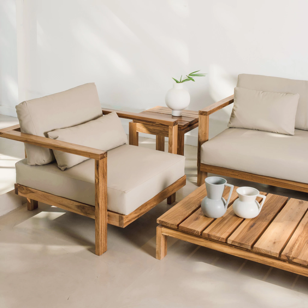 Sillón fabricado completamente en madera Petiribi maciza con tratamiento apto para exterior, la confección de sus almohadones es en goma espuma y tapizado en lona náutica la cual es una tela 100% impermeable, con proceso UV resistente a los rayos solares. Posee gran durabilidad a la intemperie y no permite la formación de moho.